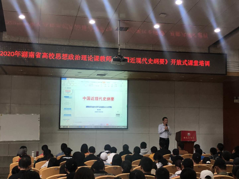 为推动习近平新时代中国特色社会主义思想进教材、进课堂、进头脑,贯彻落实学校思想政治理论课教师座谈会精神,落实习近平总书记在湖南考察时对教育工作,特别是对高校思想政治理论课建设的指导精神,进一步提高高校思想政治理论课教师教学水平,湖南省2020年继续开展高校思想政治理论课教师开放式课堂培训,其中《中国近现代史纲要》开放式课堂培训由我校承办。