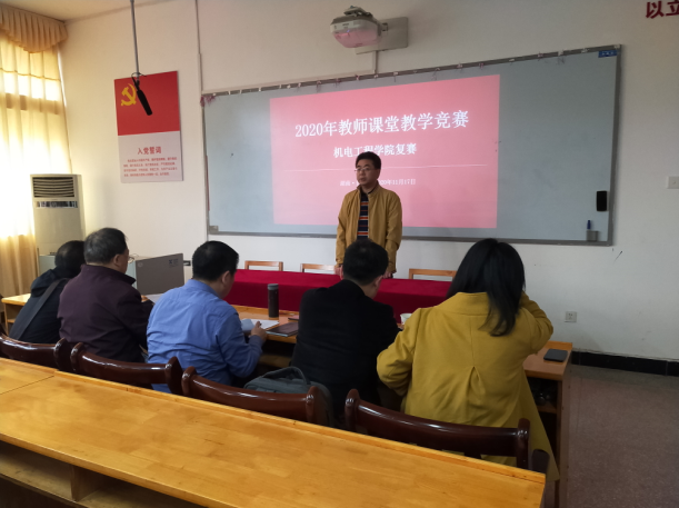 1月17日下午,机电工程学院2020年教师课堂教学竞赛复赛在八教南312会议室举行。本次复赛由莫亚武副院长主持,教务处洪彬副处长现场督查指导,吴明亮院长担任比赛评委专家组组长,学院9位基层组织负责人作为专家评委,学院无课教师全部到场观摩。