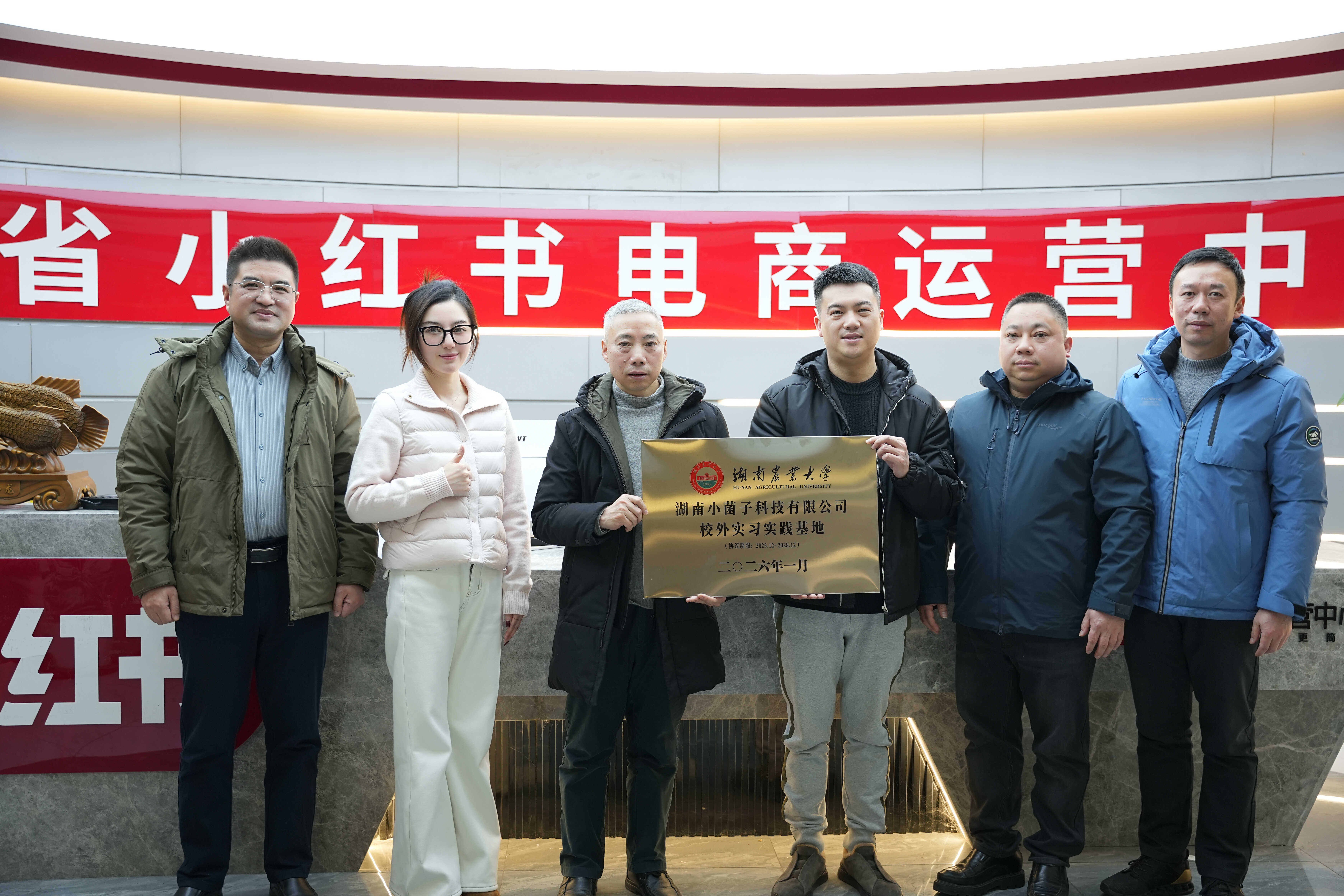 本网讯(商学院 李湘新)2026年1月21日下午,湖南农业大学商学院副院长莫鸣和唐文源、市场营销系主任周宇飞、教师王继红一行赴湖南小菌子科技有限公司(湖南省小红书电商运营中心)开展校企战略合作洽谈,并举行“校外实习基地”授牌仪式。公司董事长钱学武、项目总监龙琪等企业负责人出席活动。