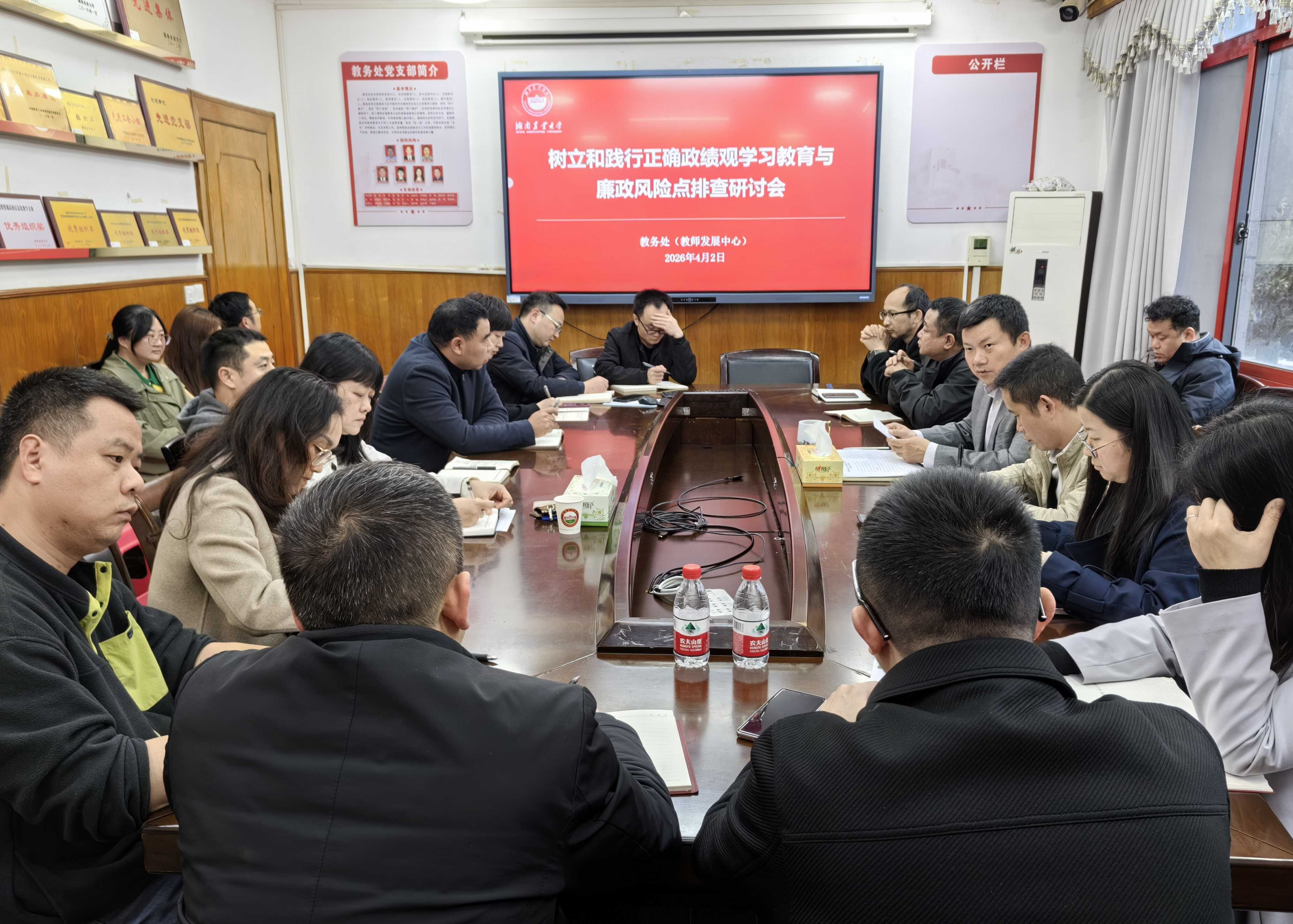 本网讯(教务处 田中 肖羽)4月2日下午,教务处召开“树立和践行正确政绩观学习教育暨廉政风险点排查”专题会议,进一步推进教学管理规范化、服务精细化。会议由教务处处长马先锋主持,教务处领导班子及全体成员参加。