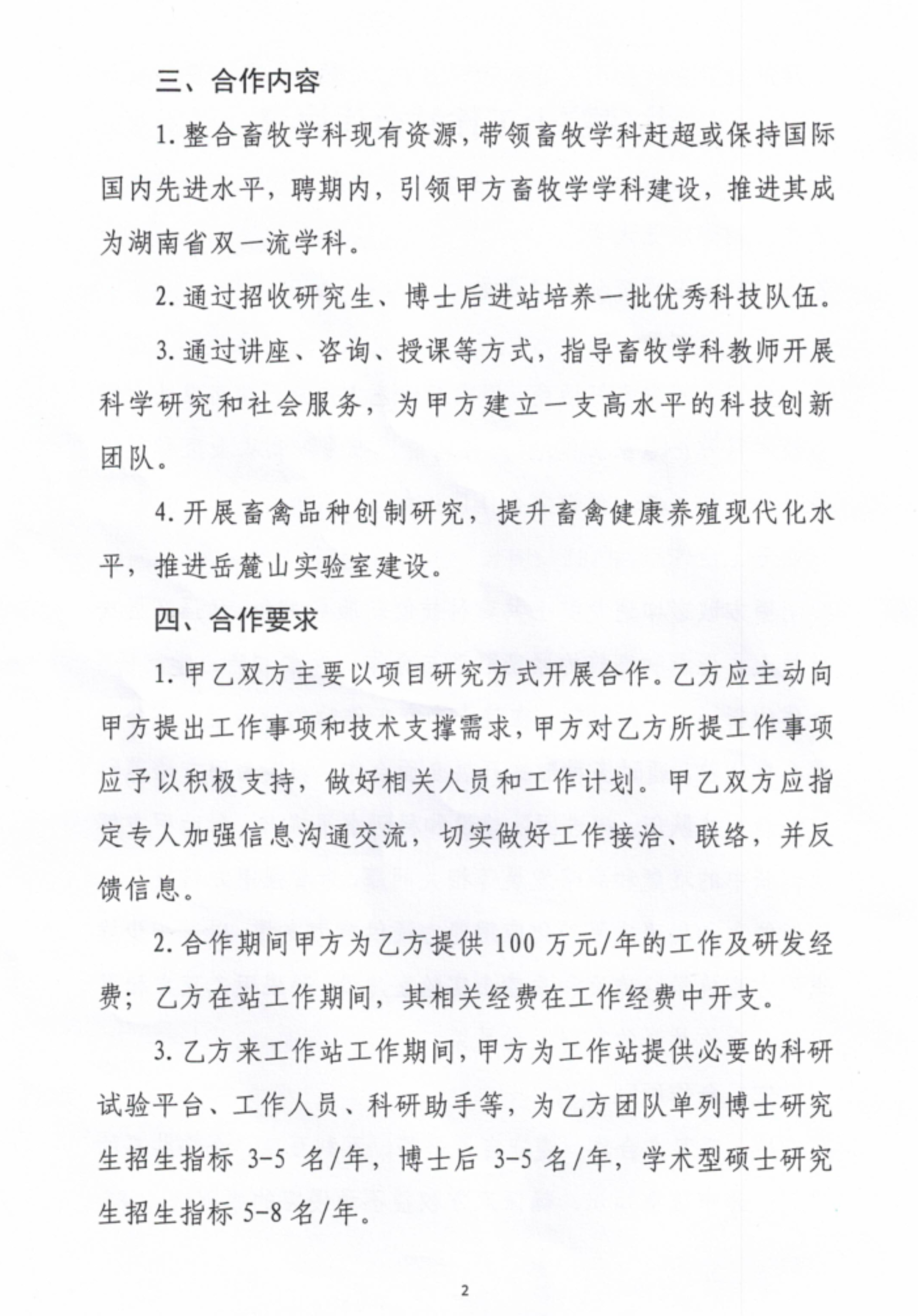主要工作任务和内容:(1)整合畜牧学科现有资源,带领畜牧学科赶超或保持国际国内先进水平,聘期内,引领甲方畜牧学学科建设,推进其成为湖南省双一流学科。(2)通过招收研究生、博士后进站,培养一批优秀科技队伍。(3)通过讲座、咨询、授课等方式,指导畜牧学科教师开展科学研究和社会服务,为甲方建立一支高水平的科技创新团队。(4) 开展畜禽品种创制研究,提升畜禽健康养殖现代化水平,推进岳麓山实验室建设。
