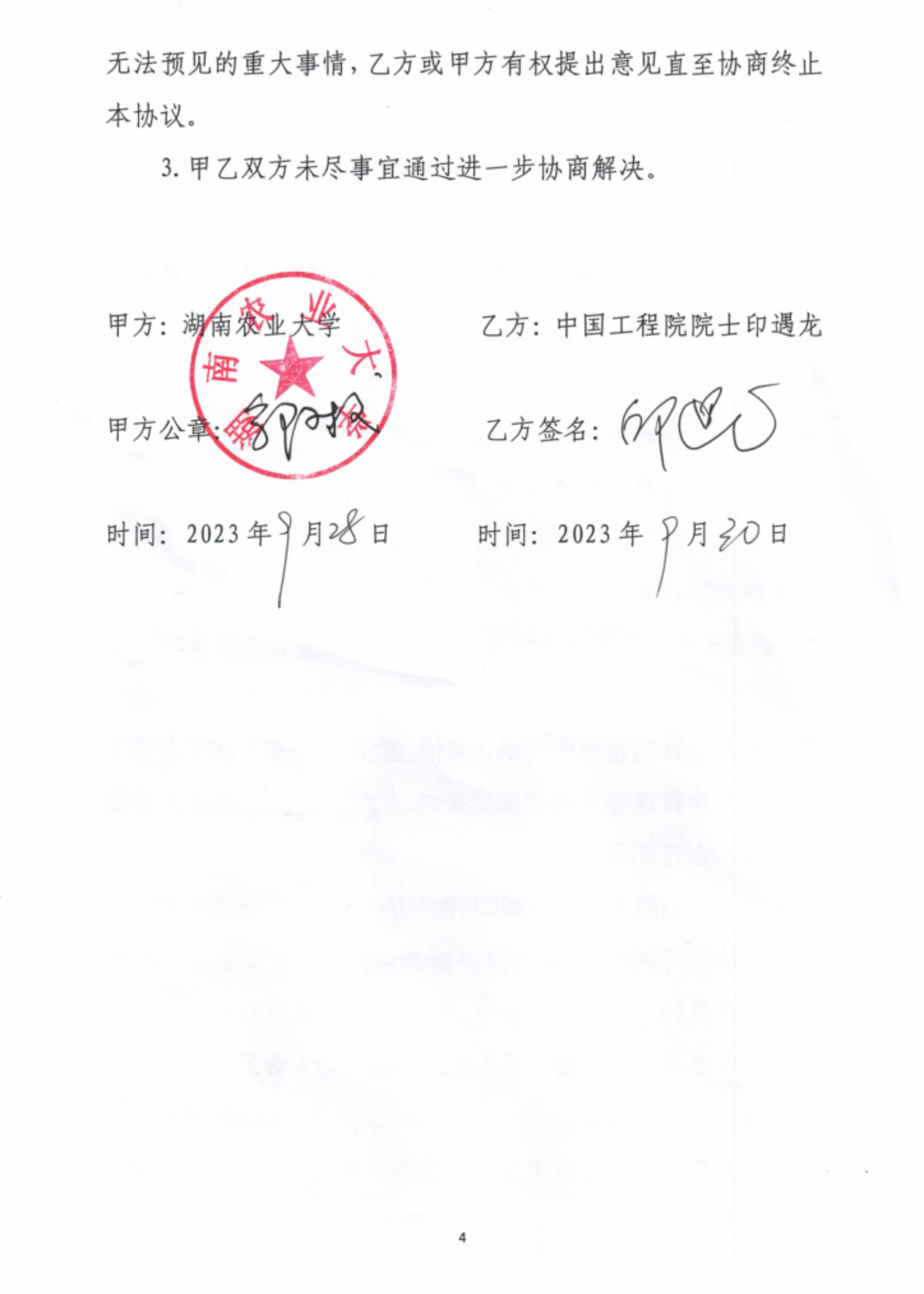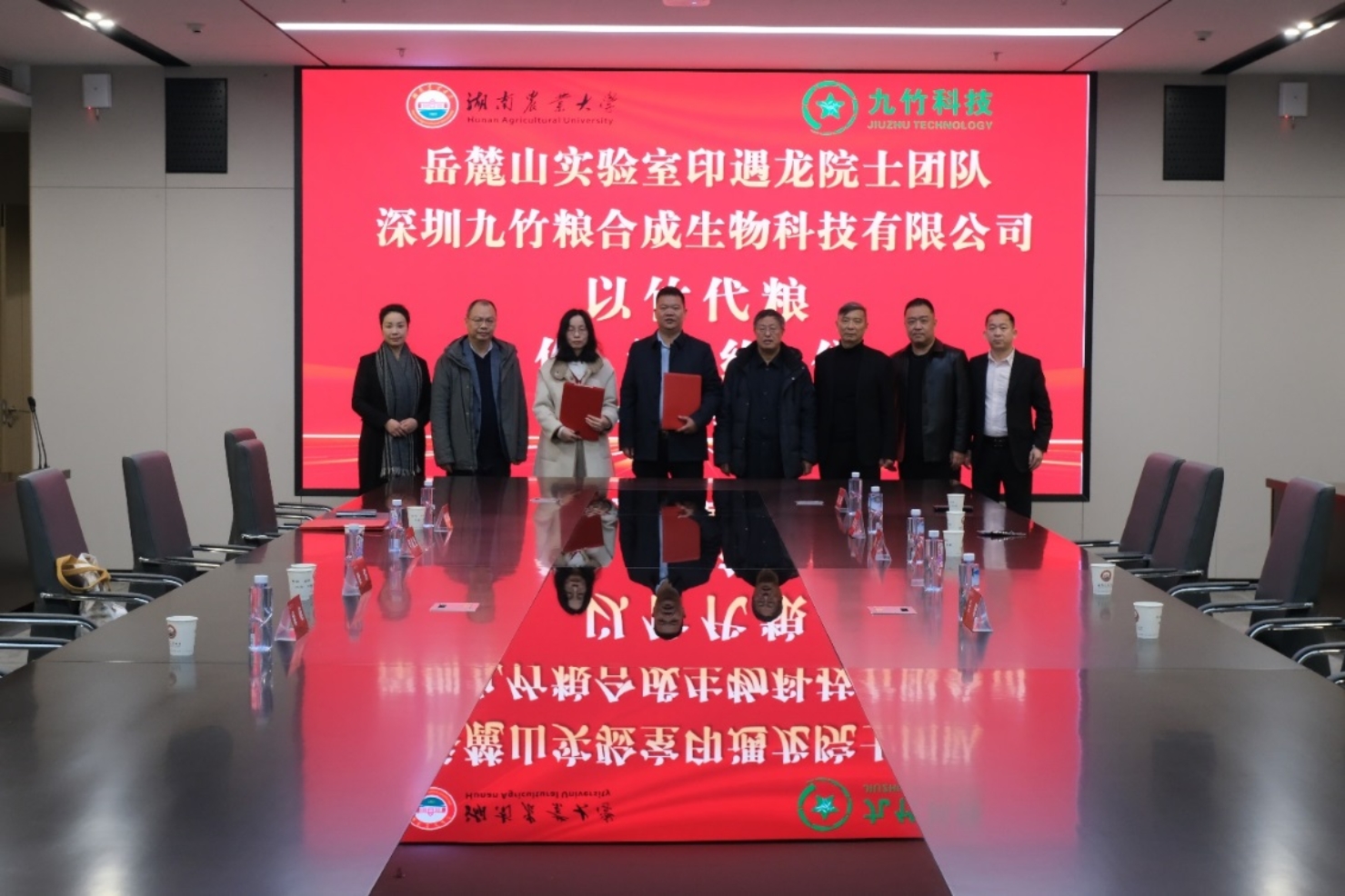 图:印遇龙院士在工作站(岳麓山实验室)与深圳九竹粮合成生物技术有限公司签订战略合作协议