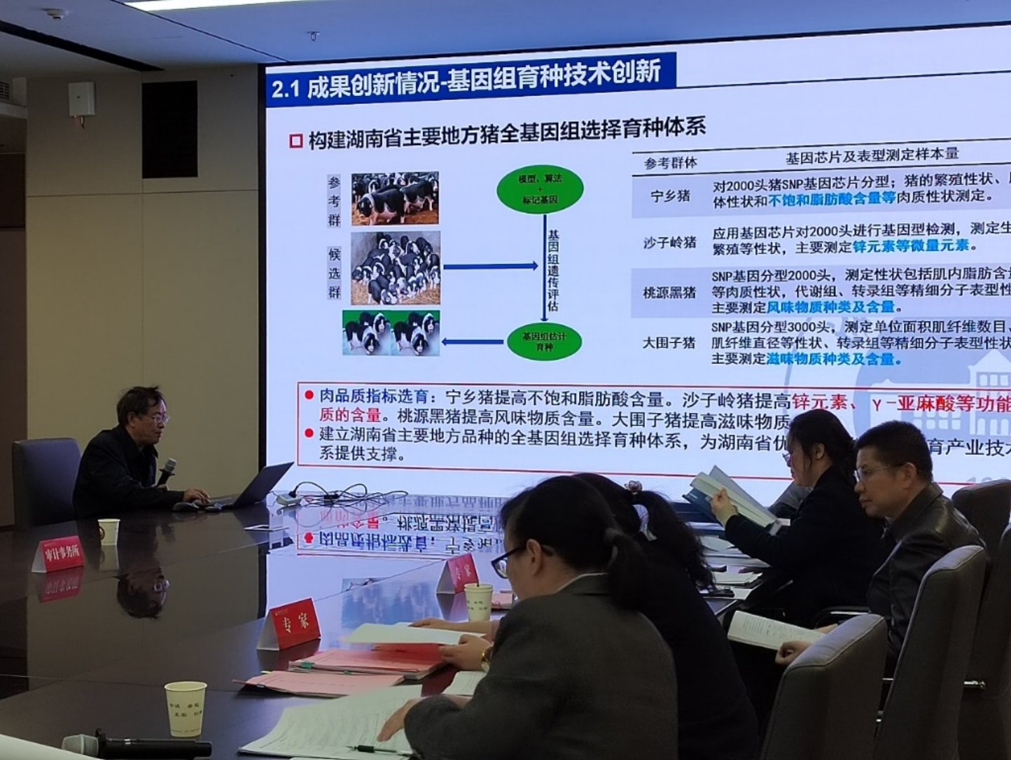 图:印遇龙院士在工作站向专家介绍最新地方猪育种成果