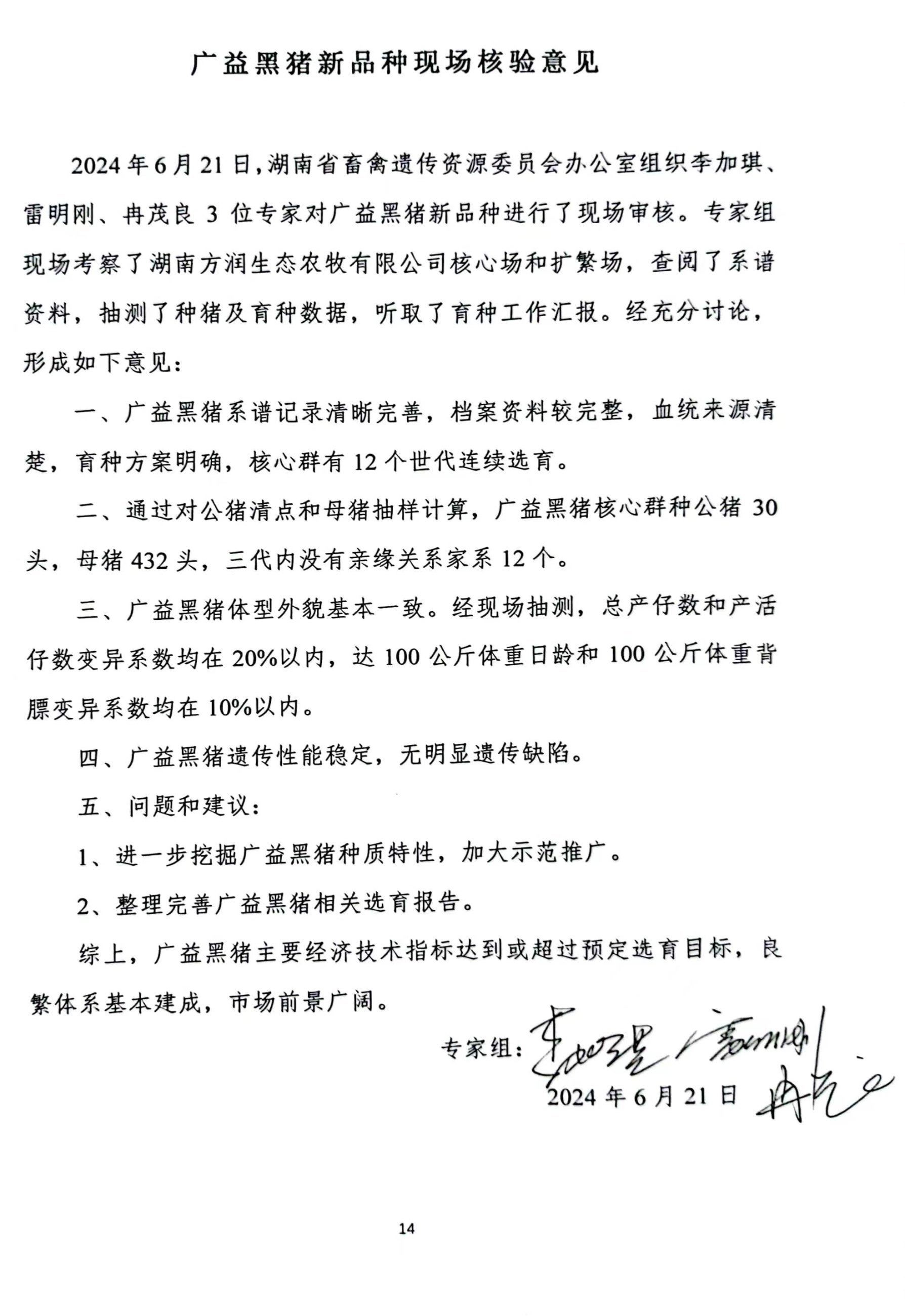 2024年6月21日,湖南省畜禽遗传资源委员会办公室组织李加琪、雷明刚、冉茂良3位专家对广益黑猪新品种进行了现场审核。专家组现场考察了湖南方润生态农牧有限公司核心场和扩繁场,查阅了系谱资料,抽测了种猪及育种数据,听取了育种工作汇报。经充分讨论,形成如下意见: 一、广益黑猪系谱记录清晰完善,档案资料较完整,血统来源清楚,育种方案明确,核心群有12个世代连续选育。 二、通过对公猪清点和母猪抽样计算,广益黑猪核心群种公猪30头,母猪432头,三代内没有亲缘关系家系12个。 三、广益黑猪体型外貌基本一致。经现场抽测,总产仔数和产活仔数变异系数均在20%以内,达100公斤体重日龄和100公斤体重背膘变异系数均在10%以内。 四、广益黑猪遗传性能稳定,无明显遗传缺陷。 五、问题和建议: 1、进一步挖掘广益黑猪种质特性,加大示范推广。 2、整理完善广益黑猪相关选育报告。 综上,广益黑猪主要经济技术指标达到或超过预定选育目标,良繁体系基本建成,市场前景广阔。
