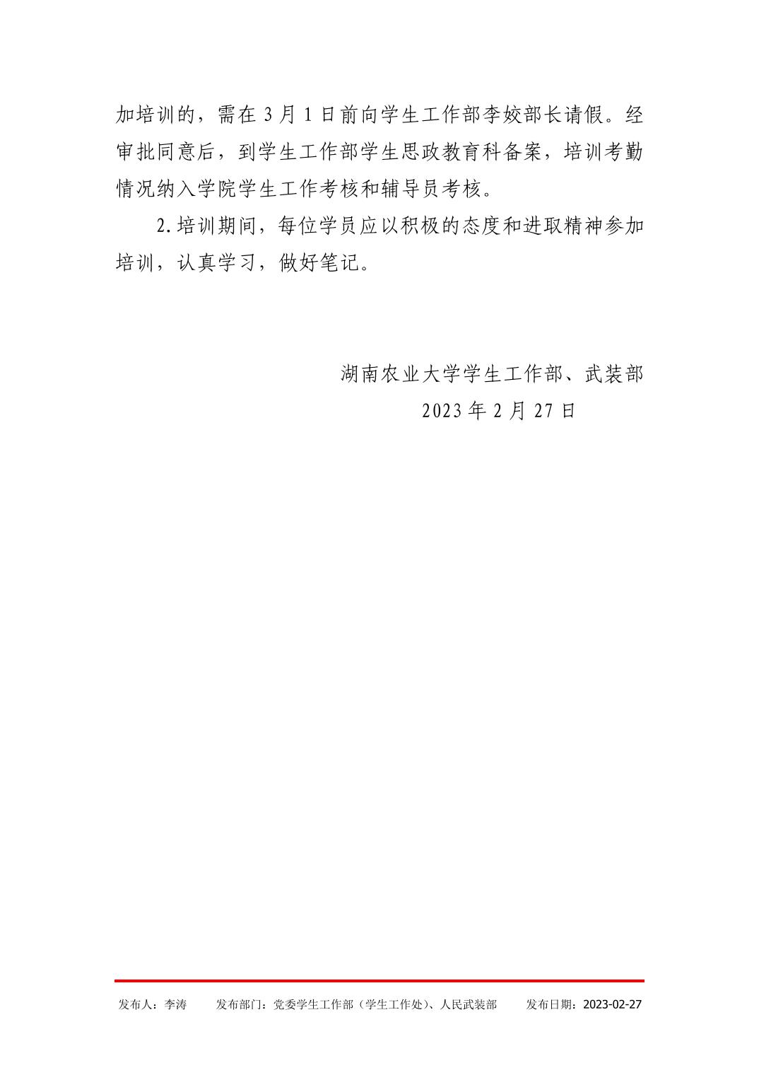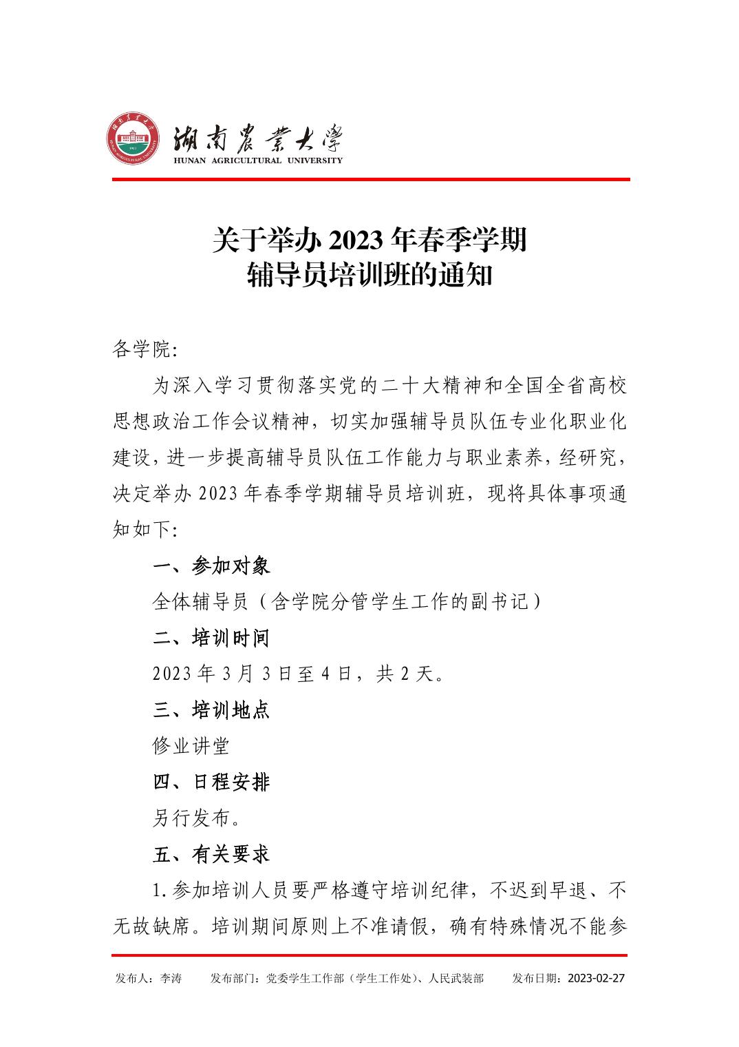 湖南农业大学2023年春季学期辅导员培训班安排表