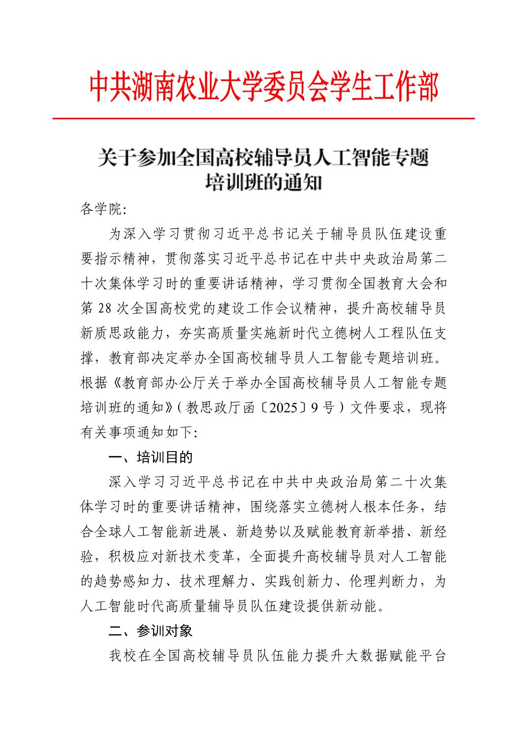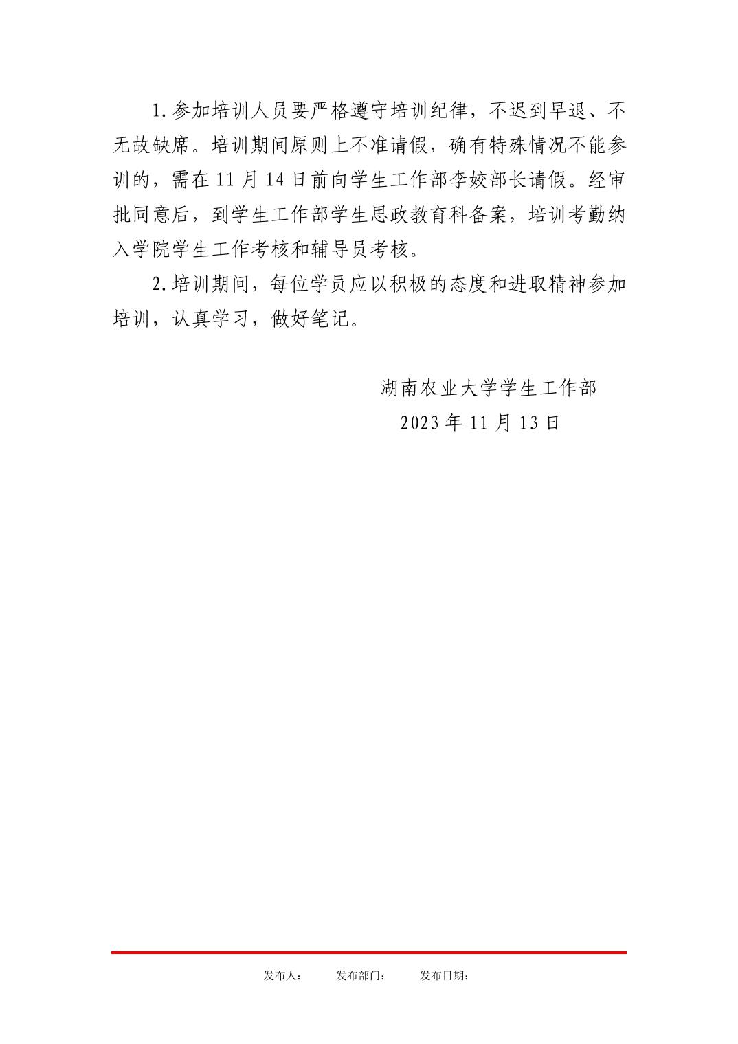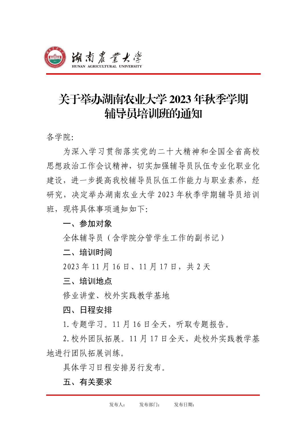 湖南农业大学2023年秋季学期辅导员培训班安排表