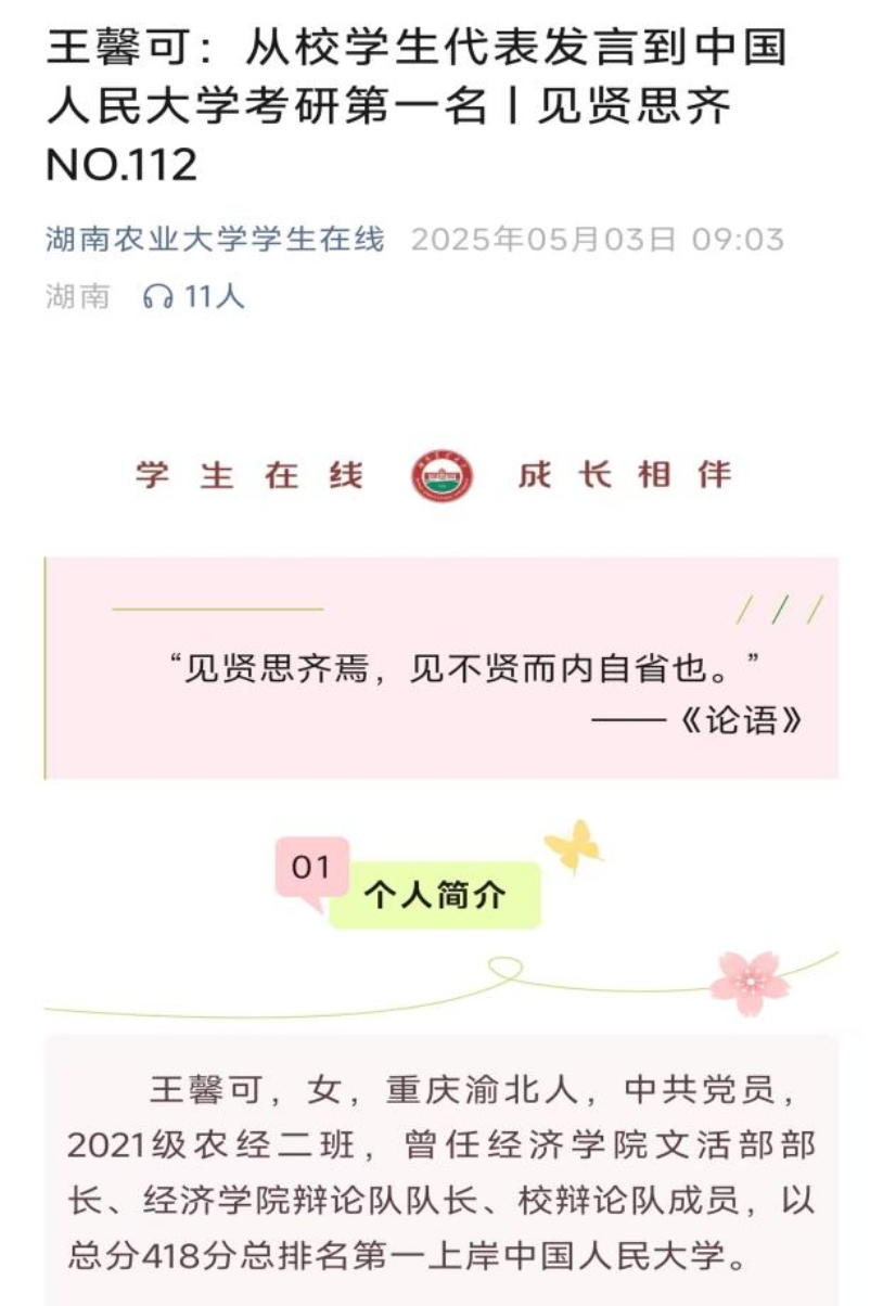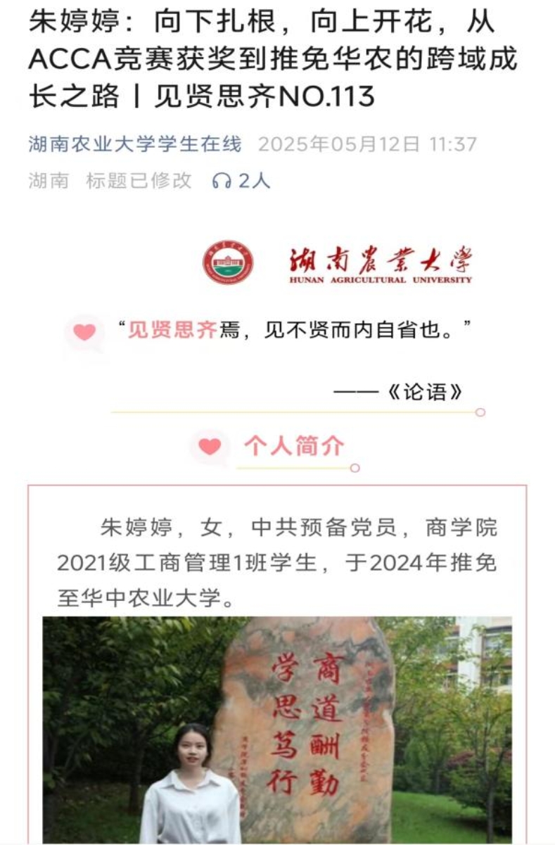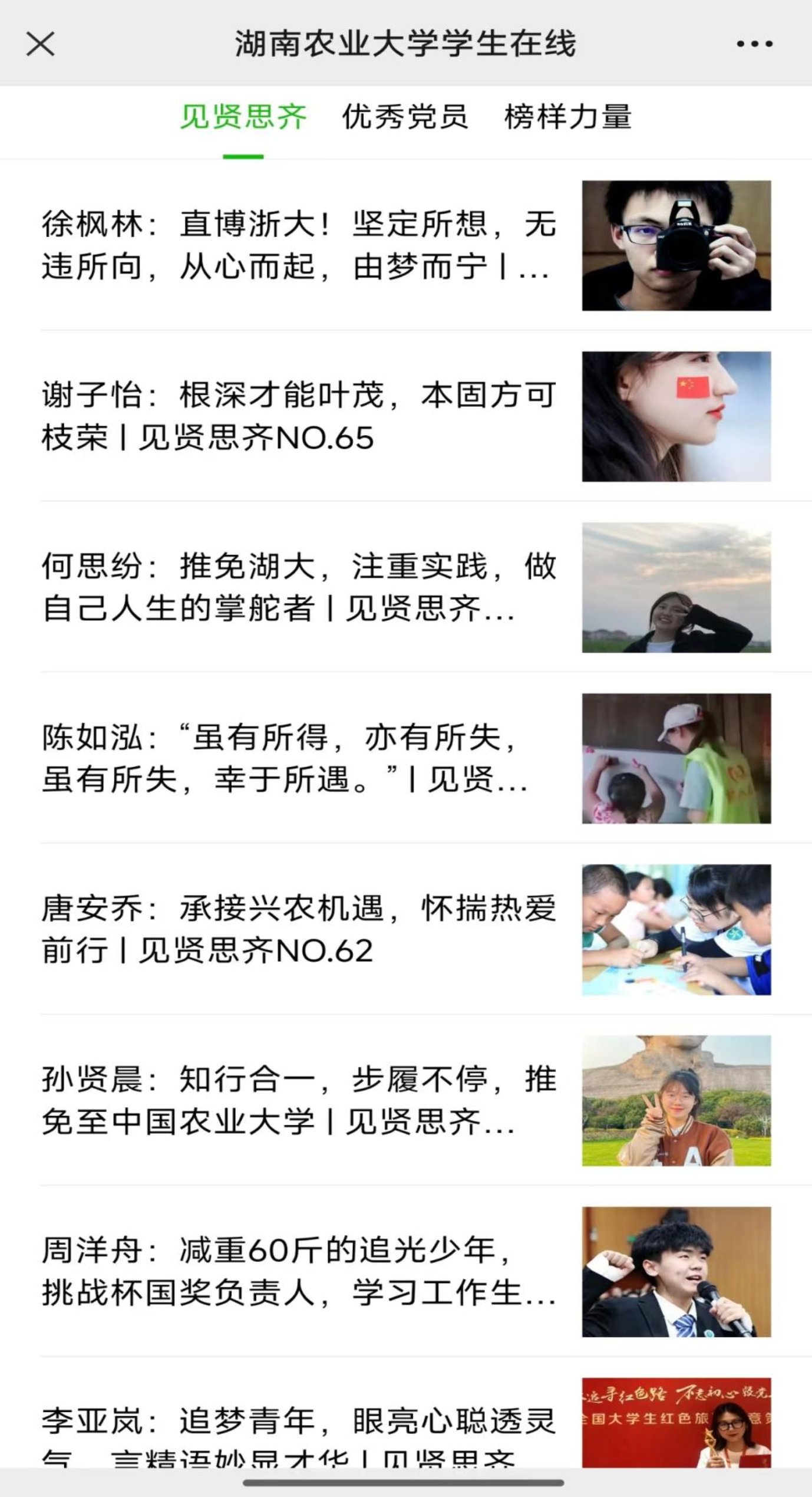 学生工作部依托“湖南农业大学学生在线”微信公众号打造“见贤思齐”微信栏目,聚焦学风建设中的先进典型宣传,目前已累计推出113期推文。栏目以“榜样引领・聚力成长”为核心定位,通过挖掘学生群体中在学业成绩、科研创新、社会实践、志愿服务等领域表现突出的个人或集体案例,以故事化、场景化的叙事方式展现榜样事迹,致力于在全校范围内营造“比、学、赶、超”的浓厚学风氛围。